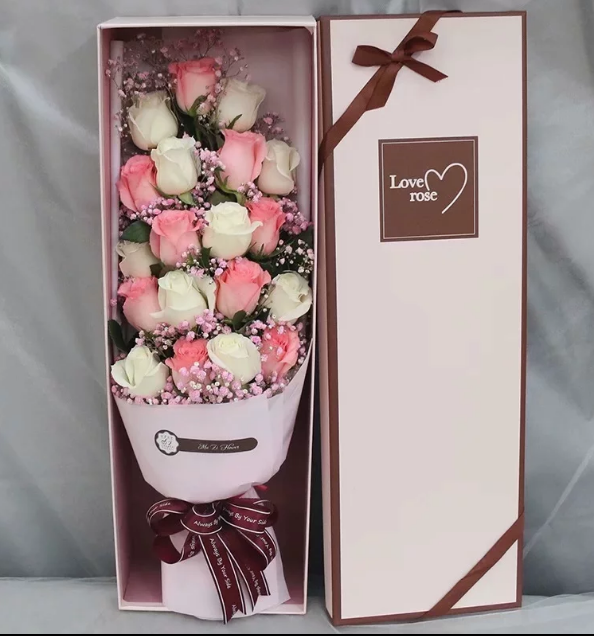 材质: 精选9枝戴安娜粉玫瑰+10枝白玫瑰,共19枝。