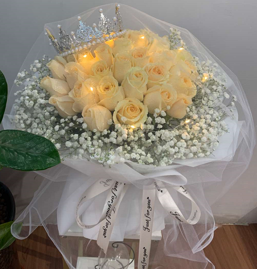 材质: 33枝香槟玫瑰,皇冠,彩灯,满天星搭配