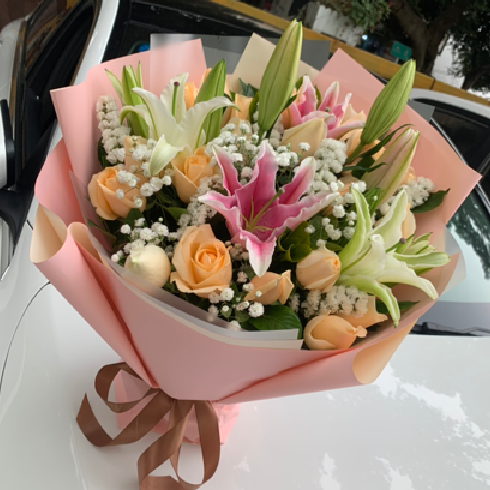 材质 15枝香槟玫瑰,8朵百合混搭,满天星,栀子叶搭配