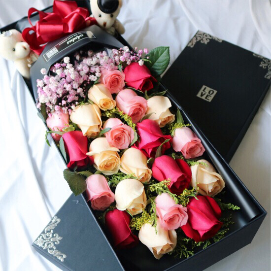材质: 6枝红玫瑰,7枝戴安娜玫瑰,8枝香槟玫瑰搭配粉色满天星,黄英