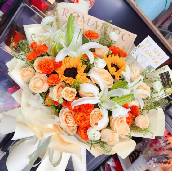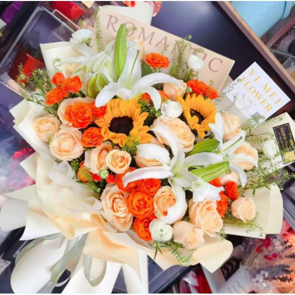 材质: 2枝向日葵,19枝香槟玫瑰,8朵百合,5枝多头橙色泡泡,绿铃草,桔梗搭配