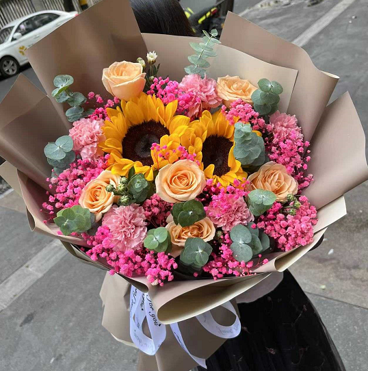 材质: 6枝香槟玫瑰,5枝粉色康乃馨,2枝向日葵,粉色满天星,尤加利叶丰满