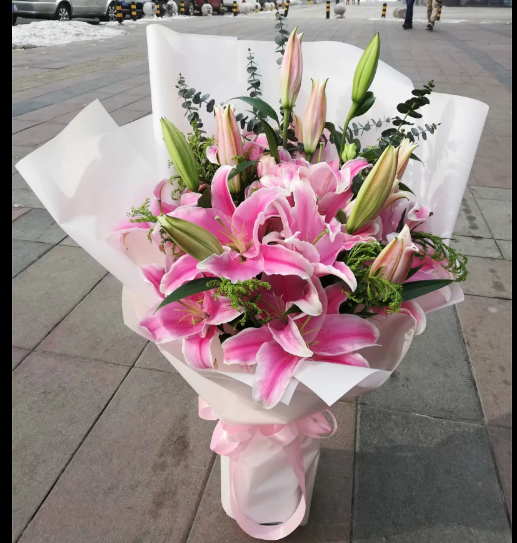 材质: 精选26朵粉百合,黄英 尤加利叶搭配
