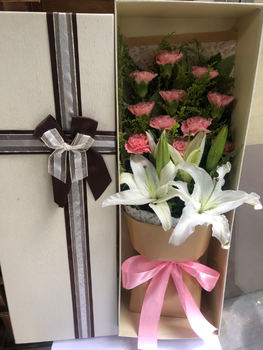 材质 11朵康乃馨,2枝百合 黄莺点缀
