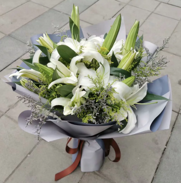 材质: 精选白百合19朵,黄英水晶草 搭配