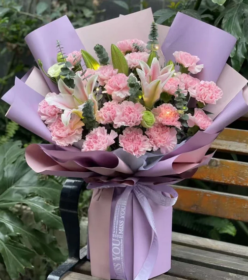 材质: 19枝粉色康乃馨,6朵粉色百合,彩灯,绿色洋桔梗,尤加利叶丰满