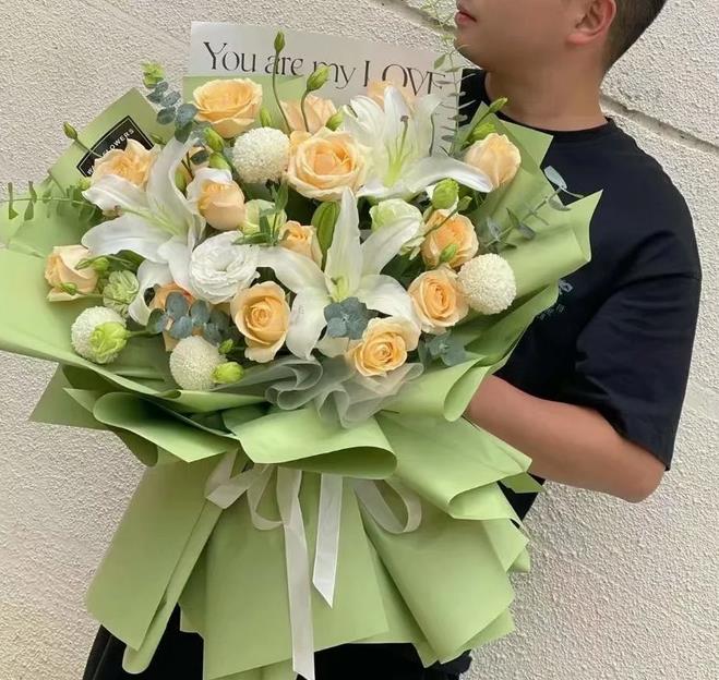 材质 19枝香槟玫瑰,4支乒乓菊,5朵百合,白色和绿色洋桔梗搭配,尤加利叶点缀