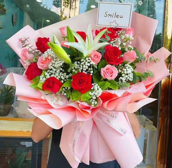 材质: 10朵戴安娜玫瑰,9朵红玫瑰,3朵百合百合,栀子叶,尤加利叶、足量满天星搭配