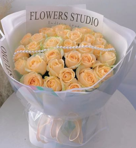 材质: 33枝香槟玫瑰,珍珠串搭配