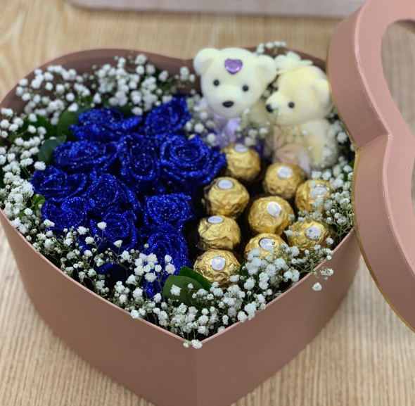 材质: 11朵蓝色妖姬,9颗巧克力,2字小熊,满天星、绿叶铺垫点缀