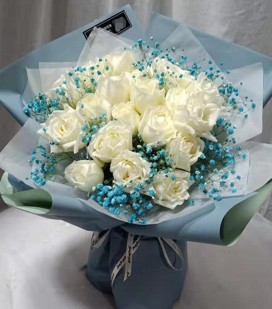 材质: 精选19枝白玫瑰,蓝色满天星点缀