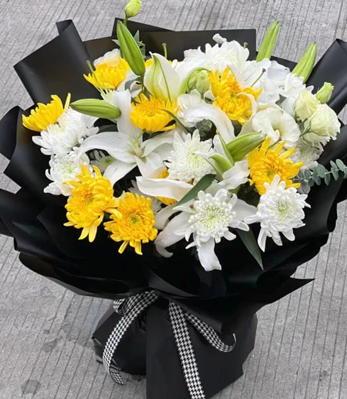 材质: 9支黄菊,12支白菊,3枝多头白百合,3枝白色洋桔梗,尤加利叶搭配