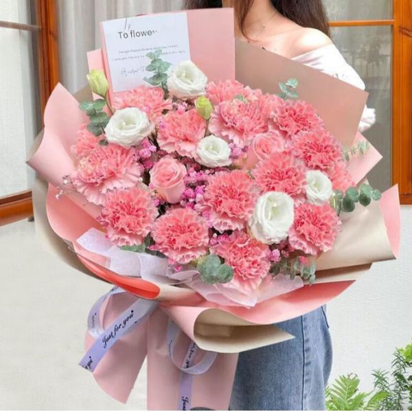 材质: 16枝粉色康乃馨,3枝戴安娜玫瑰,桔梗,尤加利叶,粉色满天星搭配