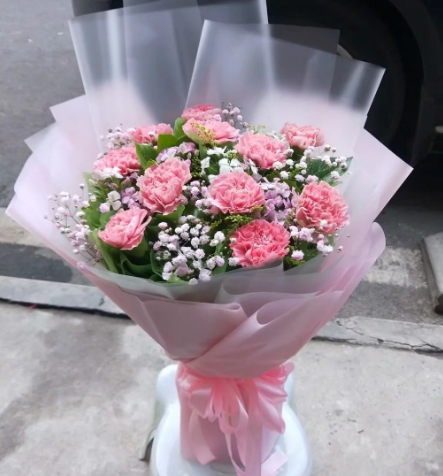 材质: 精选11枝粉色康乃馨,满天星 相思梅 黄英搭配