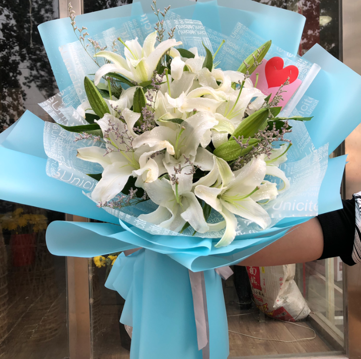 包装: 内衬白色透明字母纸,外衬天蓝色包扎纸