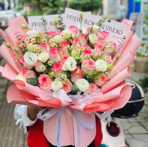 材质: 33枝艾莎玫瑰,小雏菊,尤加利叶 桔梗搭配