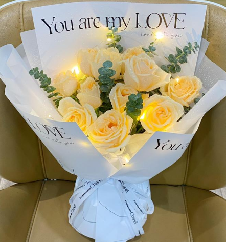 材质: 11枝香槟玫瑰,彩灯,尤加利叶丰满