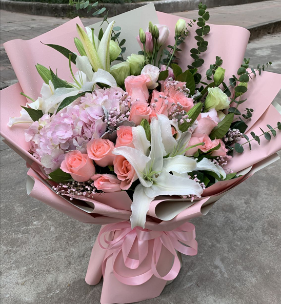 材质: 精选19枝戴安娜玫瑰,6朵白百合,一枝粉色绣球花,桔梗,尤加利叶,粉色满天星,绿叶点缀