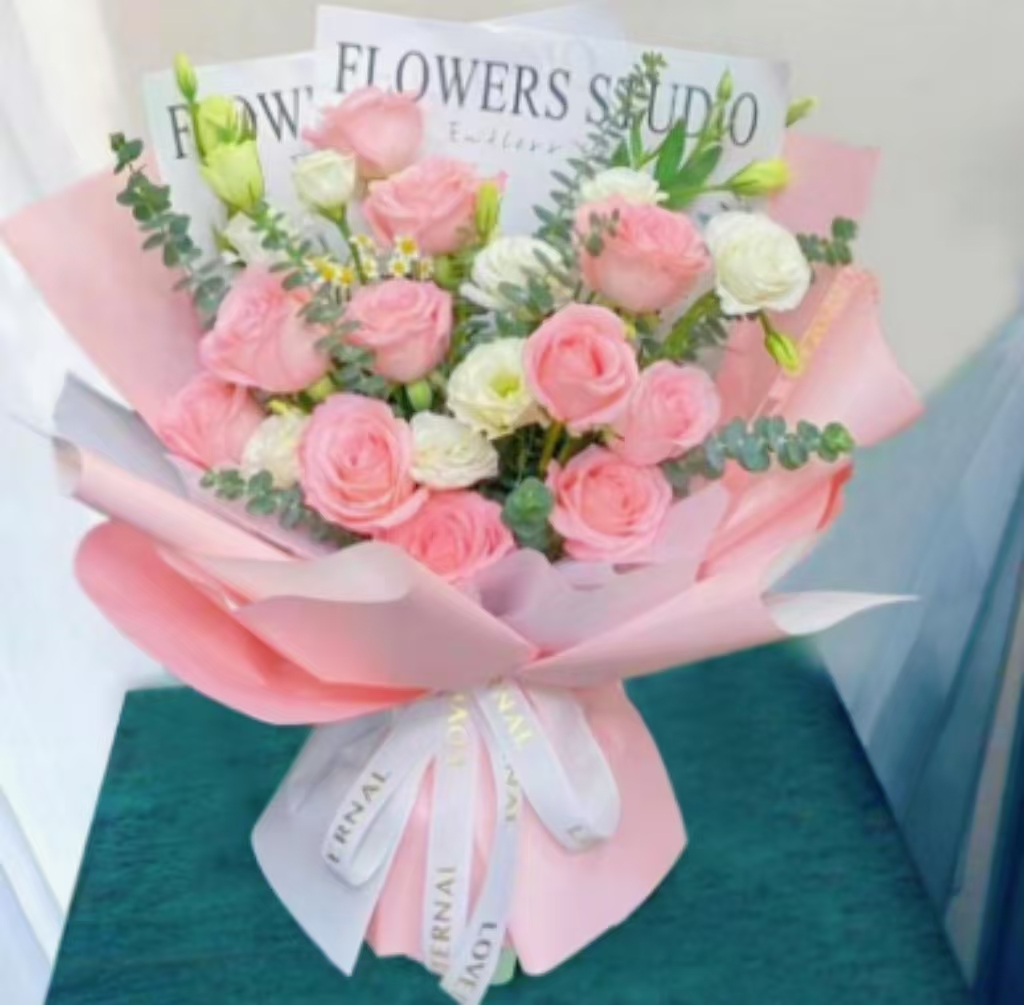材质: 11朵戴安娜玫瑰,桔梗,尤加利叶,洋甘菊搭配