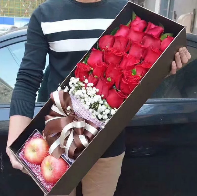 材质: 精选19枝红玫瑰,白色满天星搭配,2颗平安果