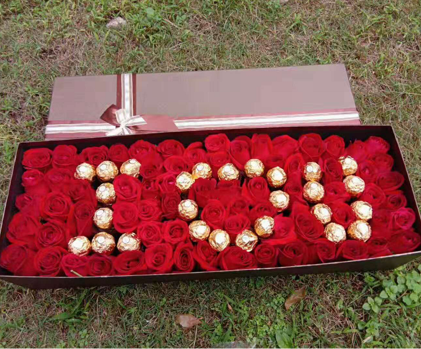材质: 精选72朵红玫瑰,27颗巧克力拼出“IOU”字样。