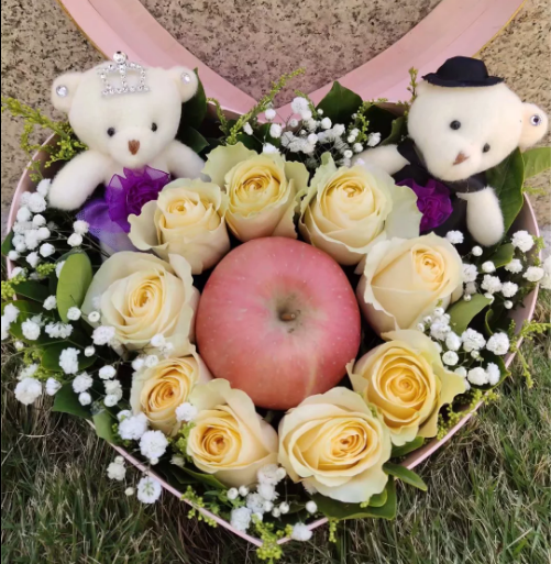 材质: 精选9朵香槟玫瑰,1颗苹果,2只小熊,满天星黄英搭配