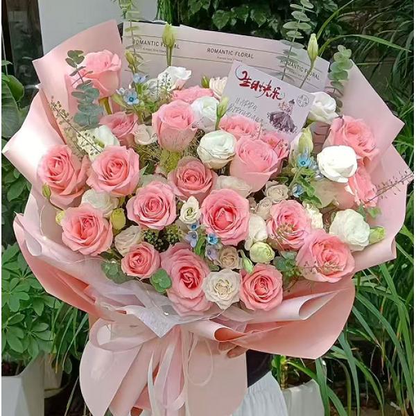 材质: 21枝戴安娜玫瑰,桔梗丰满,尤加利叶,绿铃草,蓝星花,喷泉草搭配