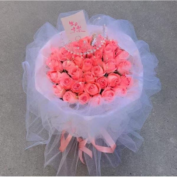 材质: 精选33枝戴安娜粉玫瑰,满天星 相思梅搭配
