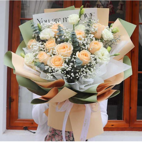 材质 11朵香槟玫瑰,满天星丰满,桔梗,尤加利叶搭配