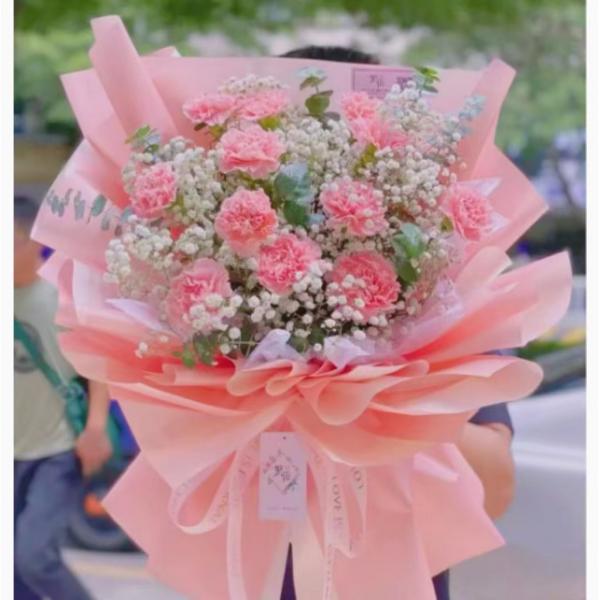 材质: 15枝粉色康乃馨,满天星丰满,尤加利叶搭配