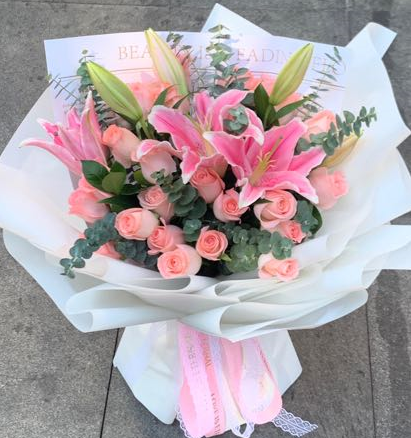 材质: 21枝粉玫瑰,3枝多头百合,尤加利叶丰满
