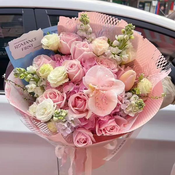 材质: 11枝粉雪山,1枝粉色绣球花,1朵蝴蝶兰,5枝白色紫罗兰,桔梗搭配