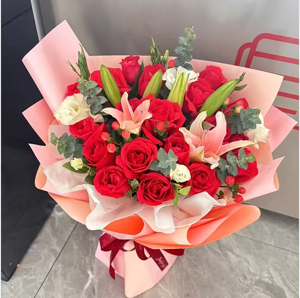材质 19枝红玫瑰,2枝多头粉百合,桔梗,尤加利叶,红豆搭配