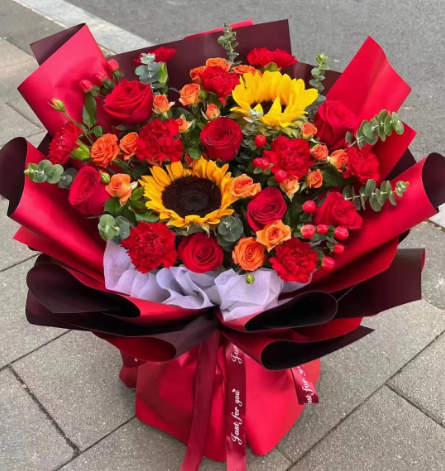 材质: 19枝红玫瑰和红色康乃馨,2枝向日葵,狂欢泡泡,红豆,尤加利叶搭配