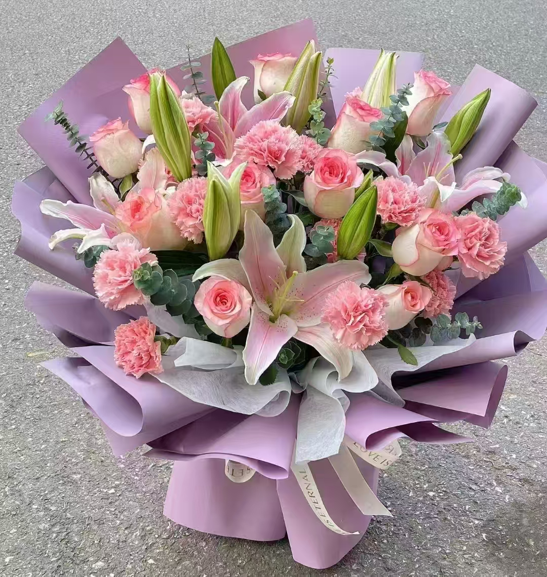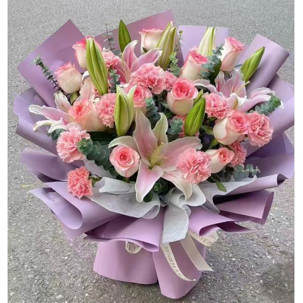 材质: 粉色康乃馨11枝,11枝爱莎玫瑰,11朵百合,尤加利叶搭配