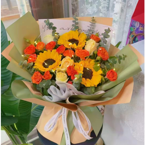 材质: (彩灯)3枝向日葵,4枝香槟玫瑰,5枝橙色泡泡,尤加利叶搭配