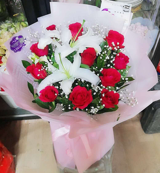 材质: 精选11枝红玫瑰,1枝多头百合,满天星,绿叶点缀