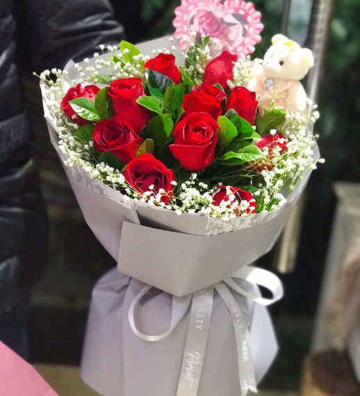材质: 11枝红玫瑰,1只小熊,绿叶,满天星搭配