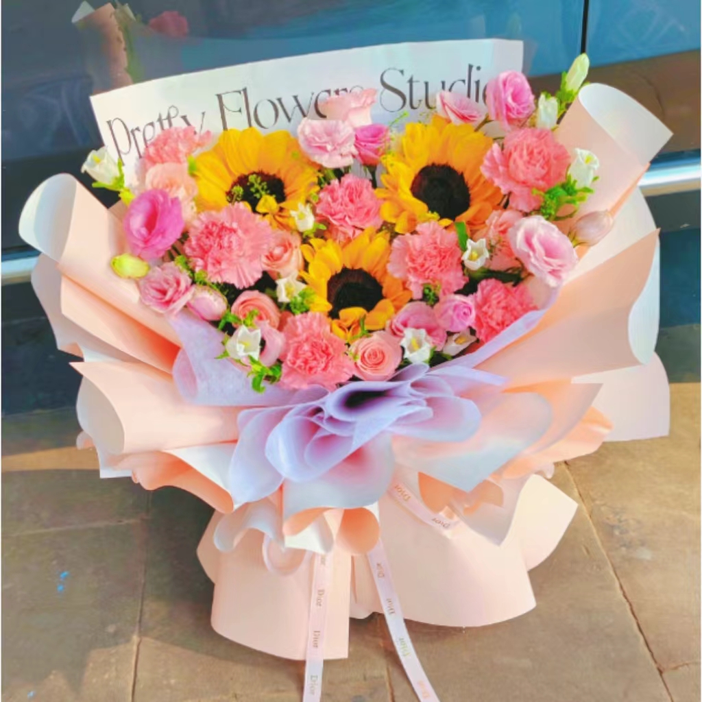 | 材质: | 8枝戴安娜,11枝粉色康乃馨,3枝向日葵, 风铃花加桔梗搭配 |