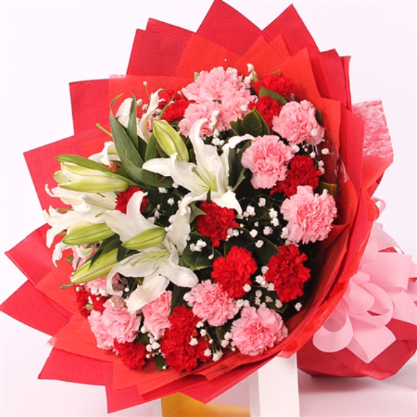 材质: 精心挑选11朵红色康乃馨和11朵粉色康乃馨,6朵百合,搭配栀子叶、满天星。