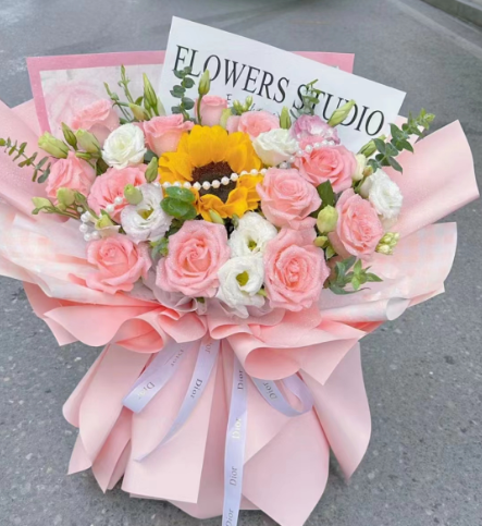 | 材质: | 15枝戴安娜,1枝向日葵,一串珍珠,白色洋桔梗,尤加利叶搭配 | ||||