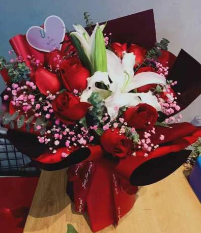 材质: 精选11枝红玫瑰,2枝百合,粉色满天星,尤加利叶间插
