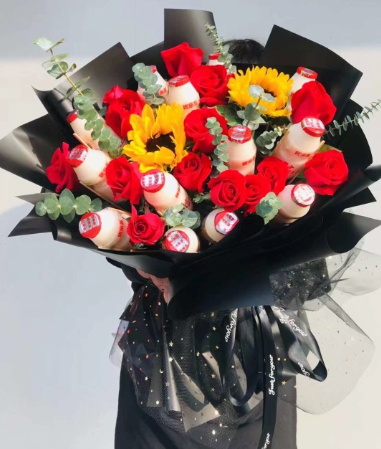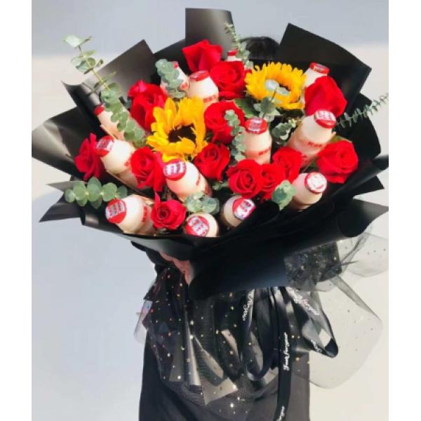 材质: 15枝红玫瑰,15瓶养乐多,2支向日葵,尤加利叶搭配