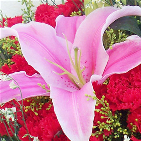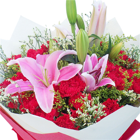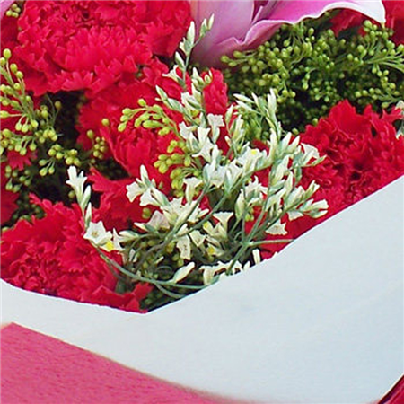 | 材质: | 19枝红色康乃馨,6朵粉色百合,搭配水晶草,黄莺 |