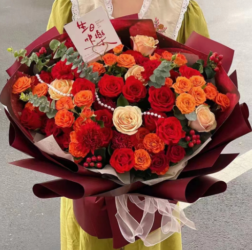 材质: 19枝红玫瑰,9枝红色康乃馨,5枝香槟玫瑰,5枝多头橙色玫瑰,红豆,尤加利叶搭配