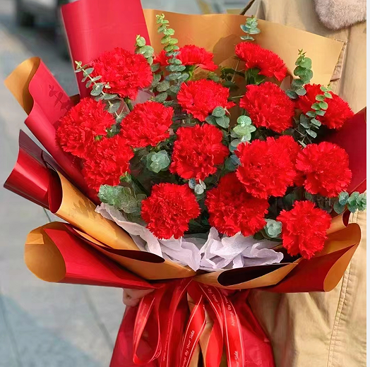 材质: 19枝红色康乃馨,尤加利叶搭配