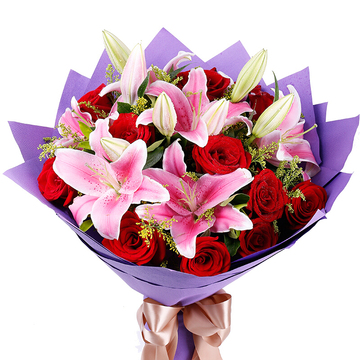 材质: 3枝多头百合,11枝红色玫瑰,黄莺间插。