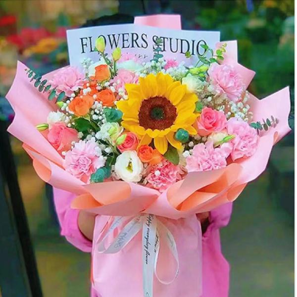 | 材质: | 8枝粉色康乃馨,3枝戴安娜。1枝向日葵,桔梗, 2枝橙色泡泡,满天星,尤加利叶搭配 |