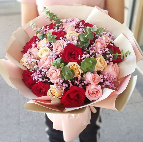| 材质: | 11朵红玫瑰 11朵香槟玫瑰 11朵戴安娜玫瑰 共33朵玫瑰 粉色满天星 尤加利叶搭配 |