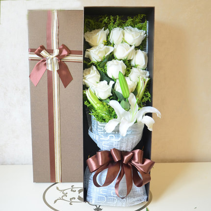 材质: 11枝白玫瑰加2枝百合,黄英搭配